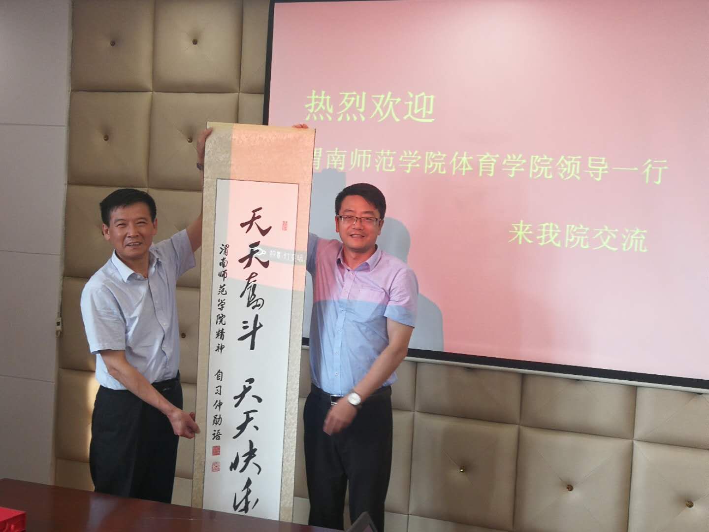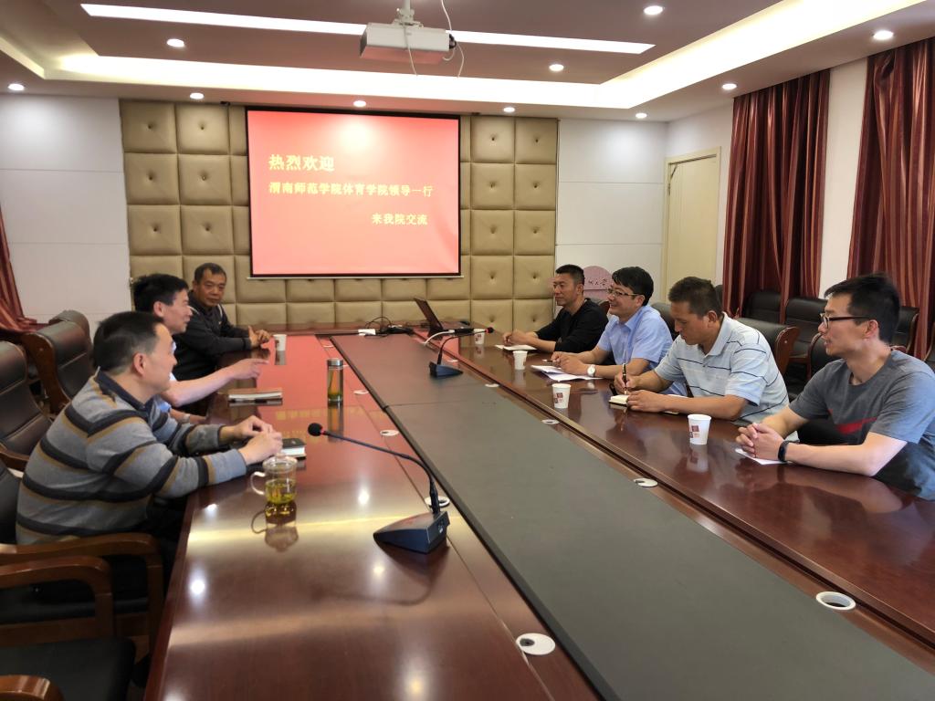 在苏州大学2138CC太阳集团会议室,首先杨清介绍了苏州大学2138CC太阳集团的基本情况,王居海介绍了太阳集团2138和2138CC太阳集团的基本情况;随后双方就体育教育专业培养目标、培养规格、课程体系、教学规范、实习见习等、学生就业、公共体育课教学、群体竞赛、运动队训练、大学生体质测试、场馆管理等方面进行了深入的研讨与交流;最后王居海向苏大2138CC太阳集团赠送了太阳集团2138精致校徽和“天天奋斗、天天快乐”的学校精神书法条幅。