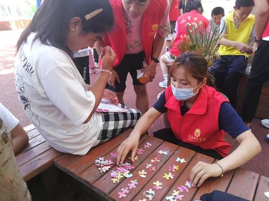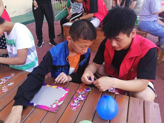 志愿者们上午8点半到达曙光特殊教育学校,随之与小朋友进行交流沟通互动,和孩子们一起玩老鹰捉小鸡的游戏,老鹰转着圈去捉小鸡,母鸡保护身后的小鸡,众小鸡则在母鸡身后左躲右闪,快乐洋溢在一个个小朋友脸上。他们还一起玩两人三足踩气球游戏,每个人的两只脚上各绑一个气球,一名志愿者与一名小朋友一组,两脚相绑形成两人三足,游戏开始后,他们拼命地去踩敌队的气球,同时还要保持自己的气球不被踩爆。全场呐喊声、欢呼声将活动推向了高潮。歇息之后,志愿者与小朋友们一起投篮、拼图画画、一起看书,画面温馨和谐,孩子们脸颊上都洋溢着可爱的笑容。