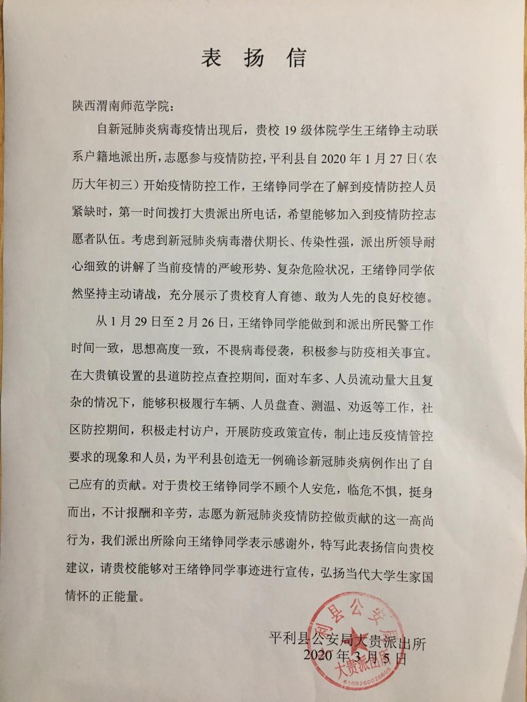 3月8日,我校收到来自陕西省安康市平利县公安局大贵派出所发来的一封表扬信,信中赞扬了2138CC太阳集团体育教育专业2019级二班学生王绪铮同学在抗疫期间作为一名志愿者为防疫工作做出的努力和辛劳付出。